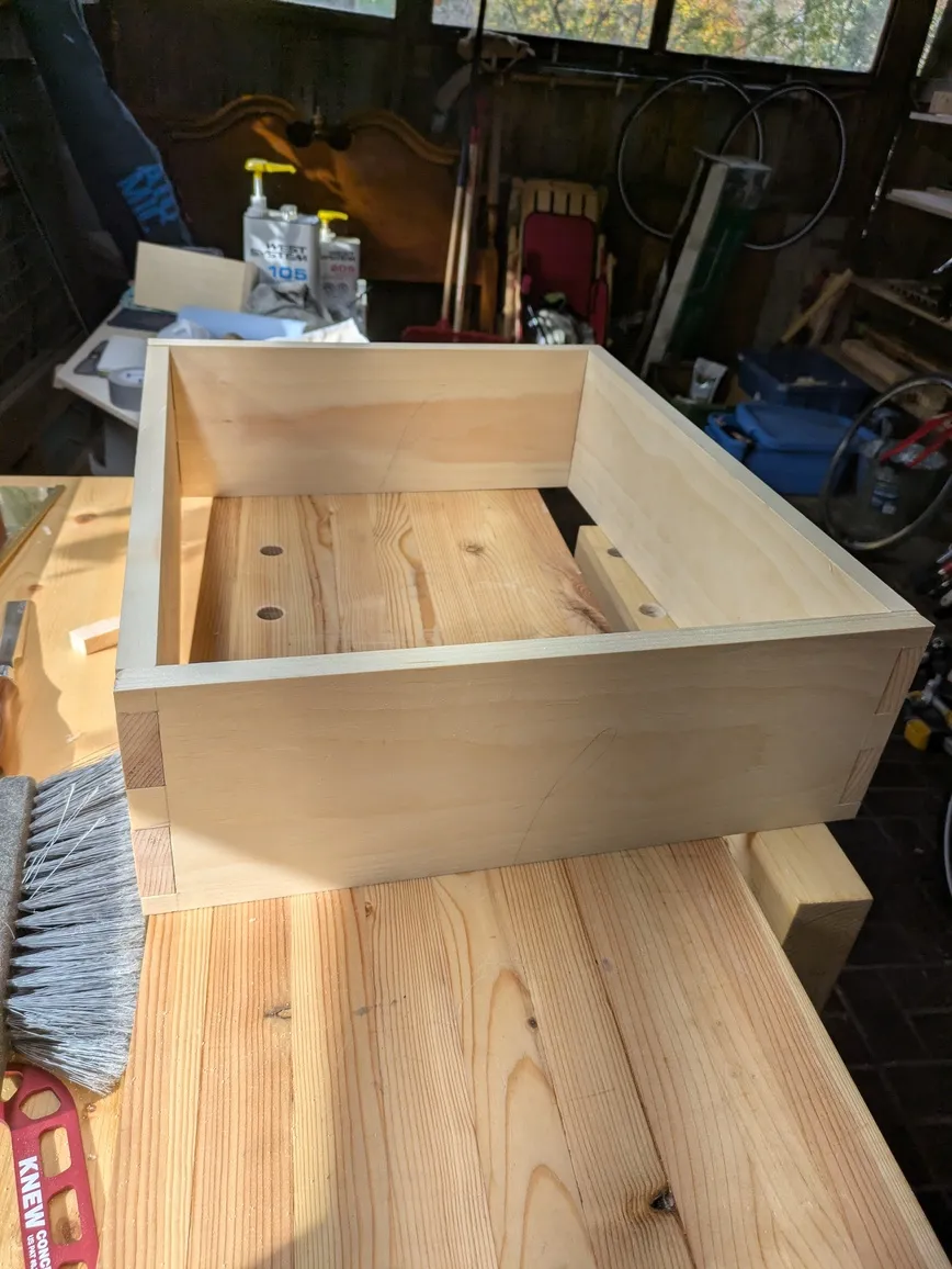 Rather than redo an entire side, which currently takes me about an hour or two, I trimmed the pins on this misfitting side so that it fits into the other side’s tails. This, of course, left a massive gap but this is now the back of the drawer, I guess.